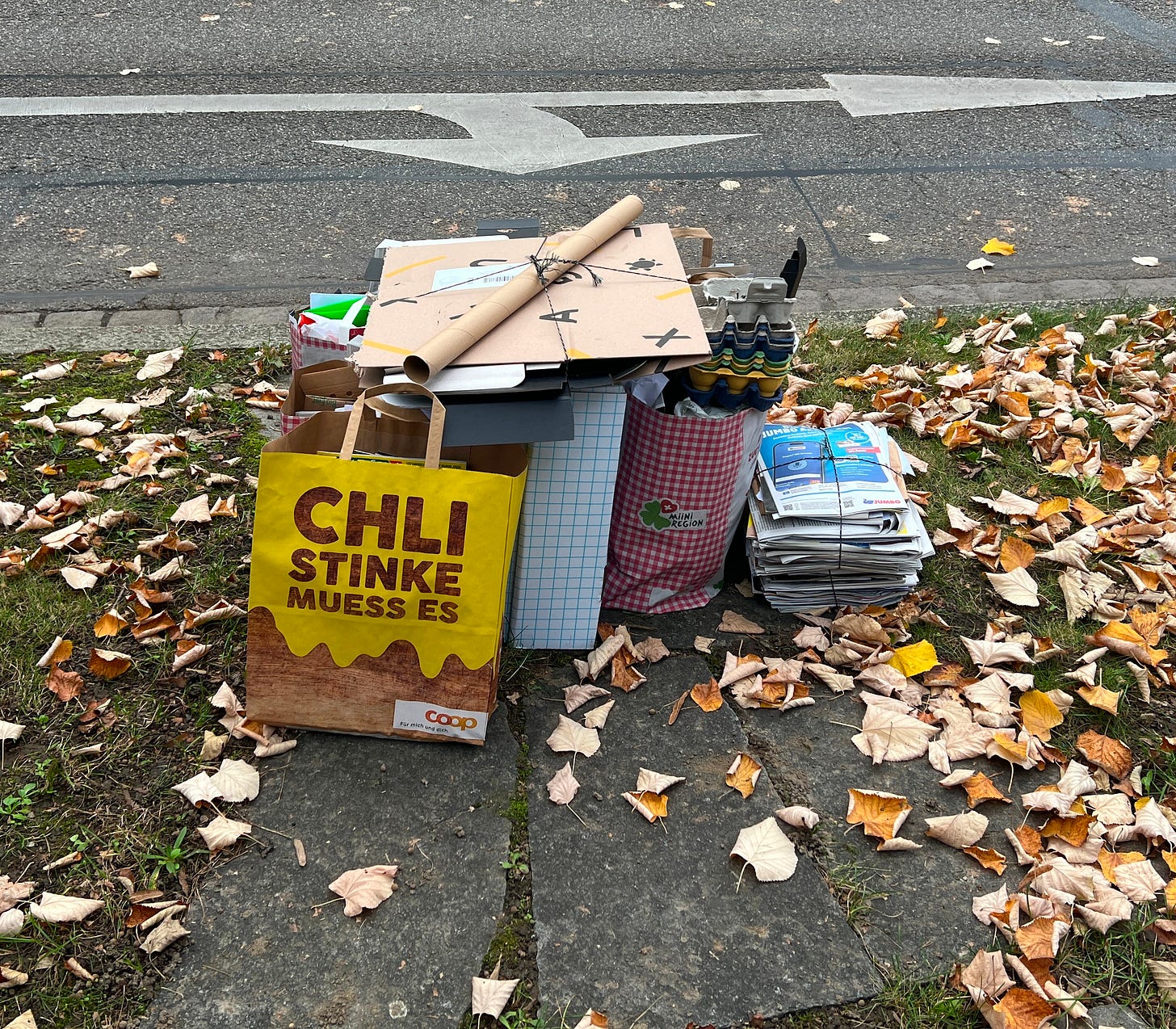 Last year for Swalloween, I dressed Laurel as a slightly dowdy pink snow leopard, a costume Oliver found in the robust side-of-the-road economy here. It rivals New York City’s, and this costume was full of holes and stained, and yet was lovingly folded and smelled of flowery detergent and lavender fabric softener. That’s a Swiss roadside score. It’s the costume equivalent of how they do paper recycling. These pictures depict last month’s recycling. Guess which pile belongs to the foreigners?